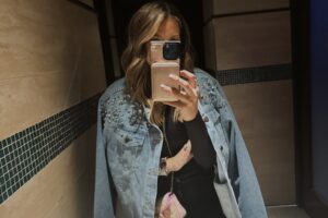 In a small sequin basketball sweater, size 4 silver metallic jeans, sneakers and accessories for March madness spring outfit – all fits TTS.
