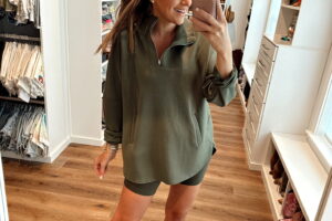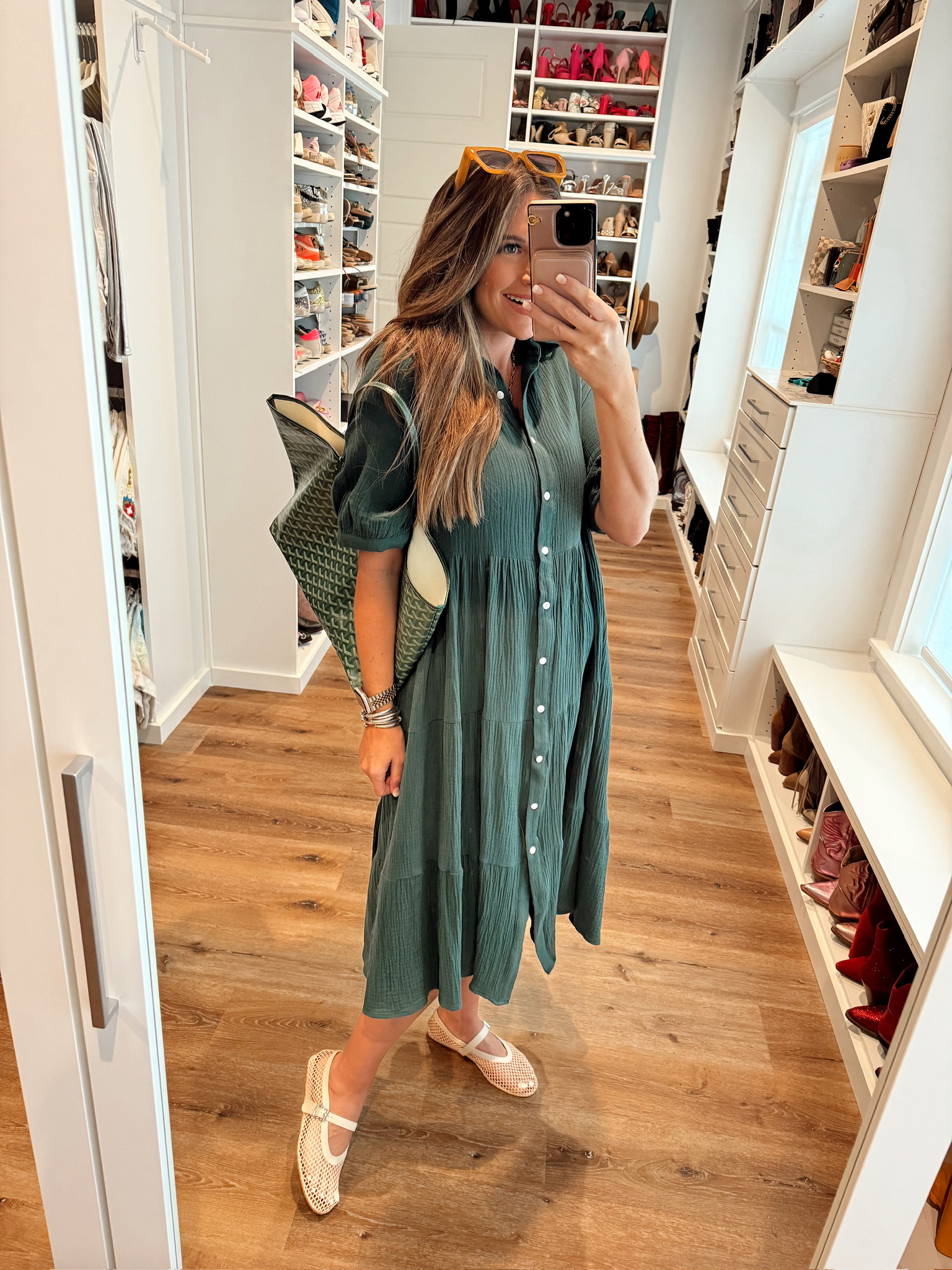In a size medium in muslin dress for my bump, ballet flats and accessories – all fits tts. Shop the items here!