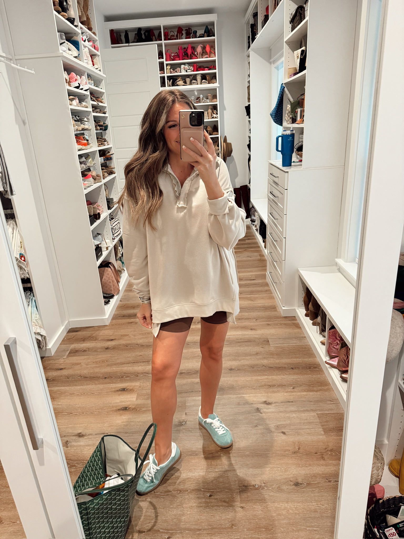 In a size xl in sweatshirt for my bump, small maternity biker shorts and sneakers – all fits tts. Shop the items here!