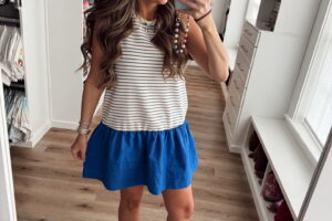 In a medium drop waist tank dress, Minnie ears, sunglasses, sandals and accessories- all fits tts. Baby boy Mickey onesie linked! Shop the items here!
