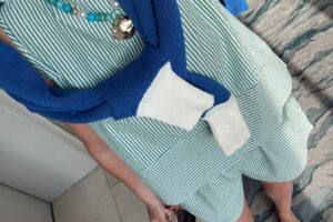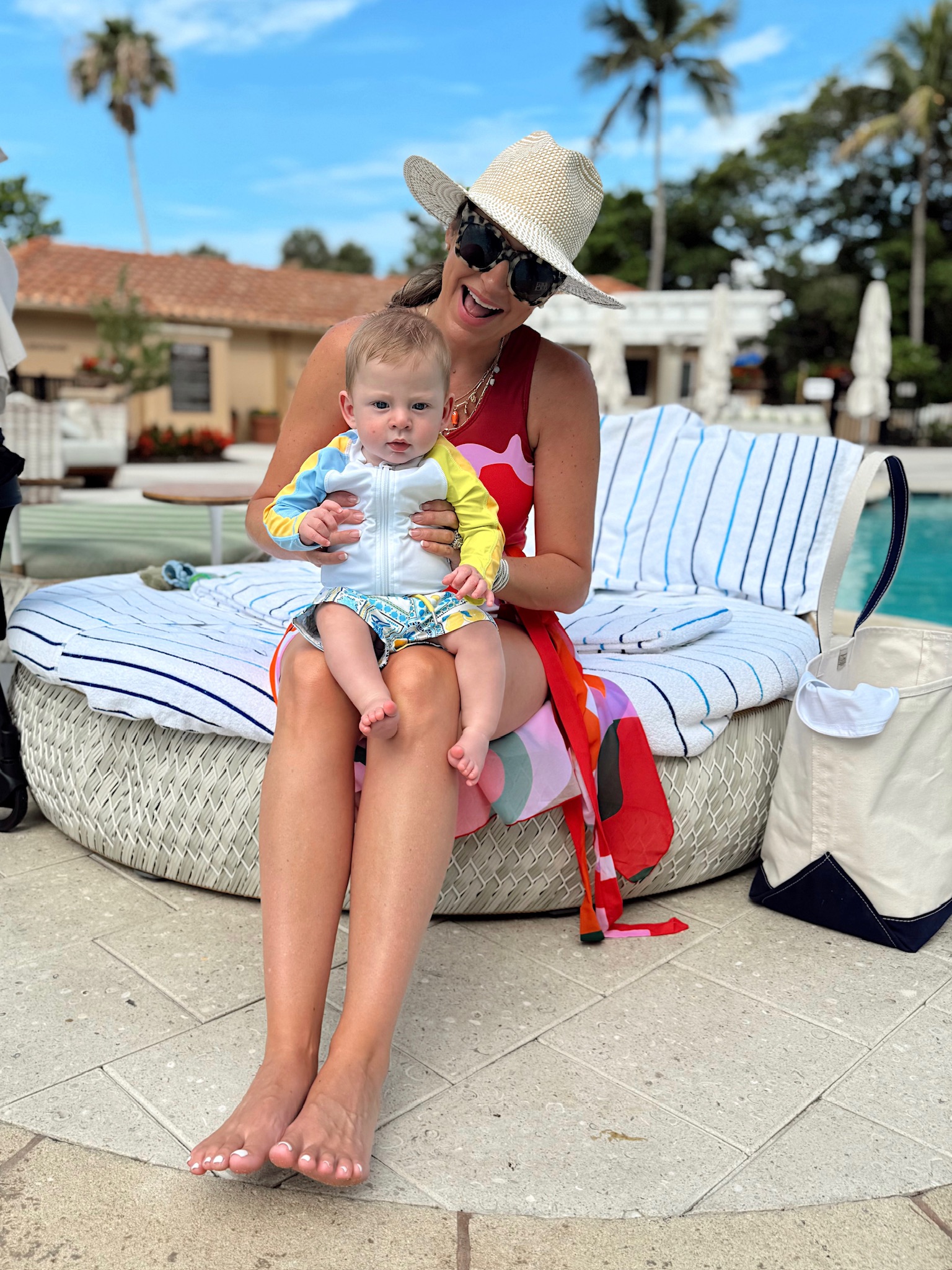 Mommy & me pool day! I’m in a large 2 piece swimsuit set with one shoulder one piece and matching sarong, sunglasses, necklaces and hat – all fits tts. Storms swim suit is mixed and matched from the two linked! Shop the items here!