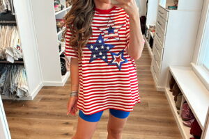 In a medium sequin star 2 piece set, raffia slides and accessories for patriotic look- fits tts. Shop the items here!