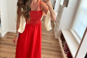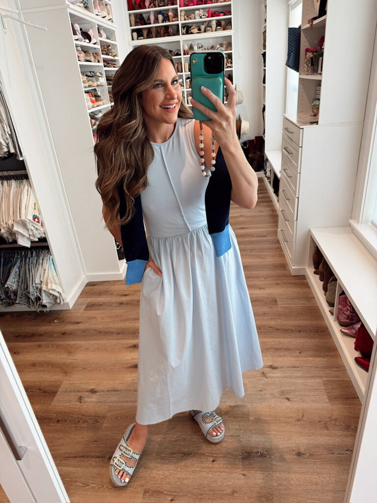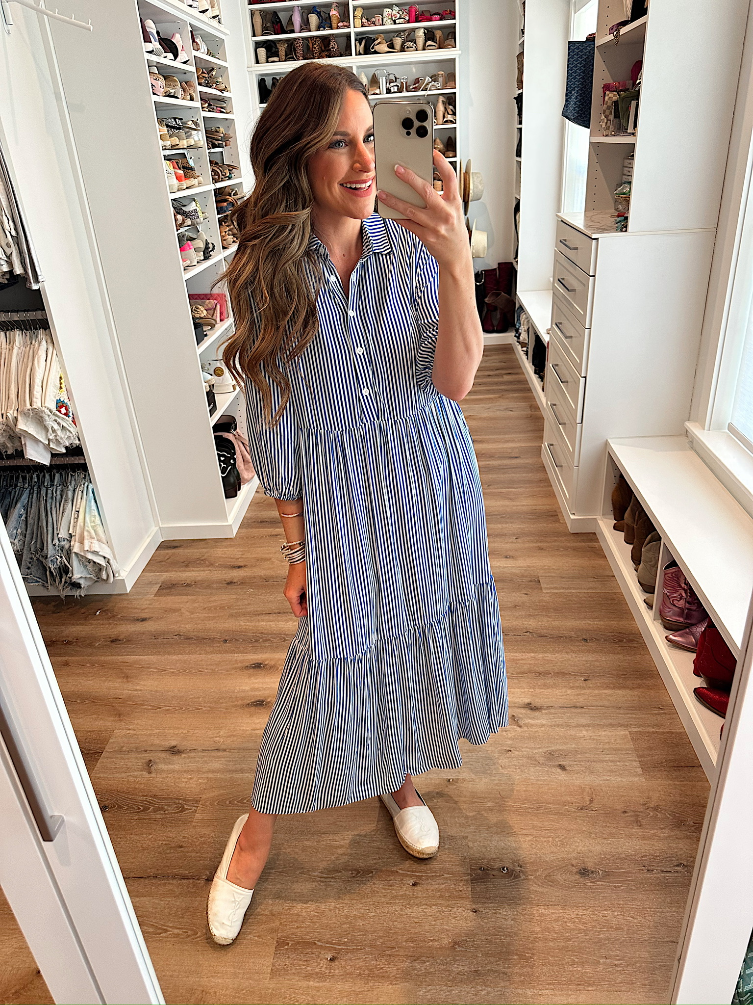 In a medium stripe polo shirt maxi dress, espadrilles and accessories for patriotic look- fits tts. Shop the items here!