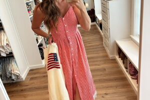 In a medium twist front maxi, tie up espadrille wedges and accessories for patriotic look- fits tts. Shop the items here!