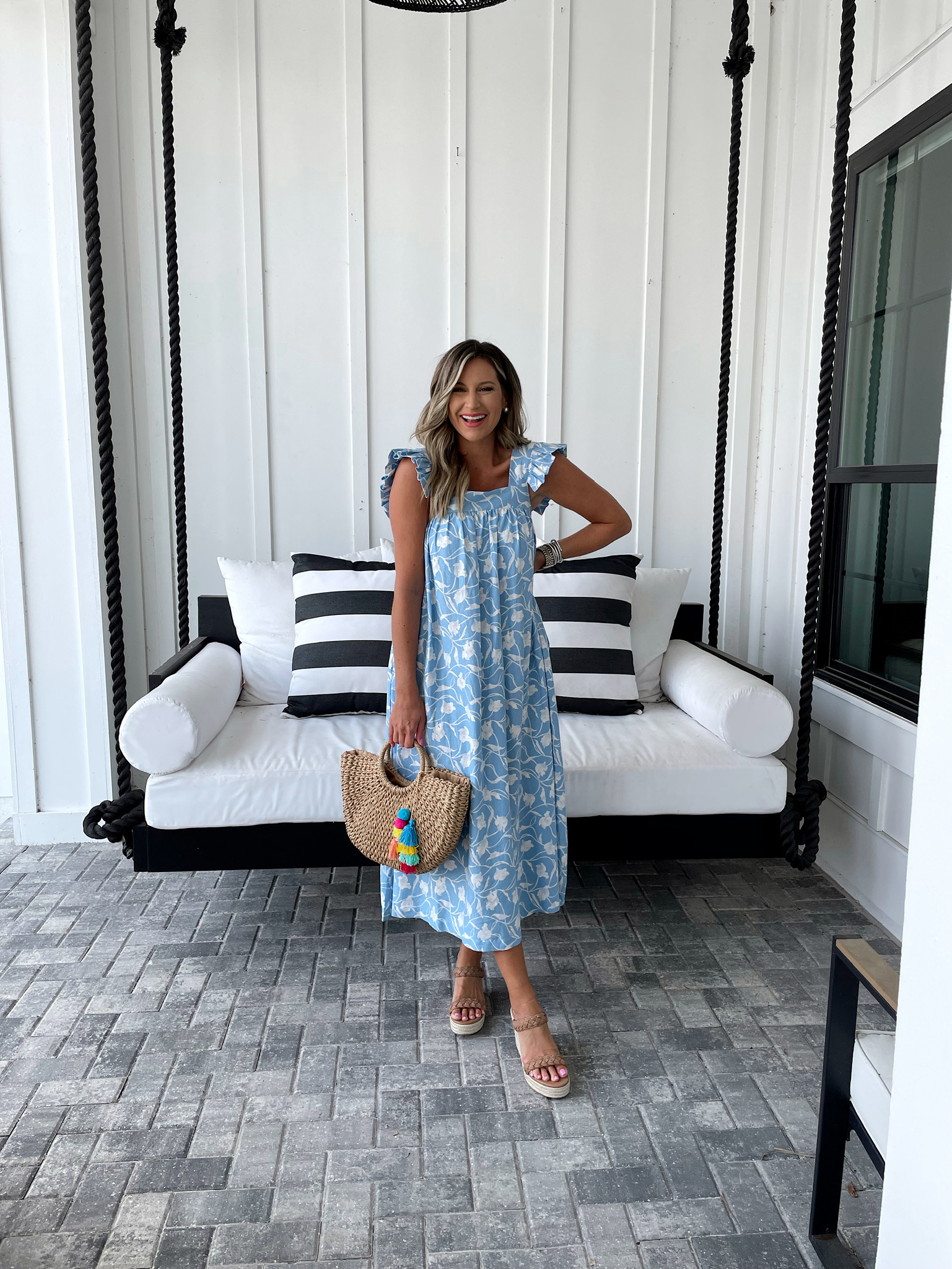 Patio chairs, Patio swing dupe, Side table, Side table, Pillows, Pillows, Rug