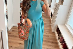 In a medium colorful sequin stripe t shirt dress, sneakers and accessories – fits tts. Shop the items here!