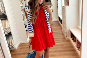 In a medium smocked top maxi slit dress, sandals, necklace and accessories – all fits TTS.