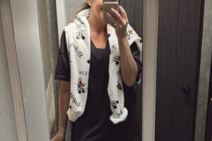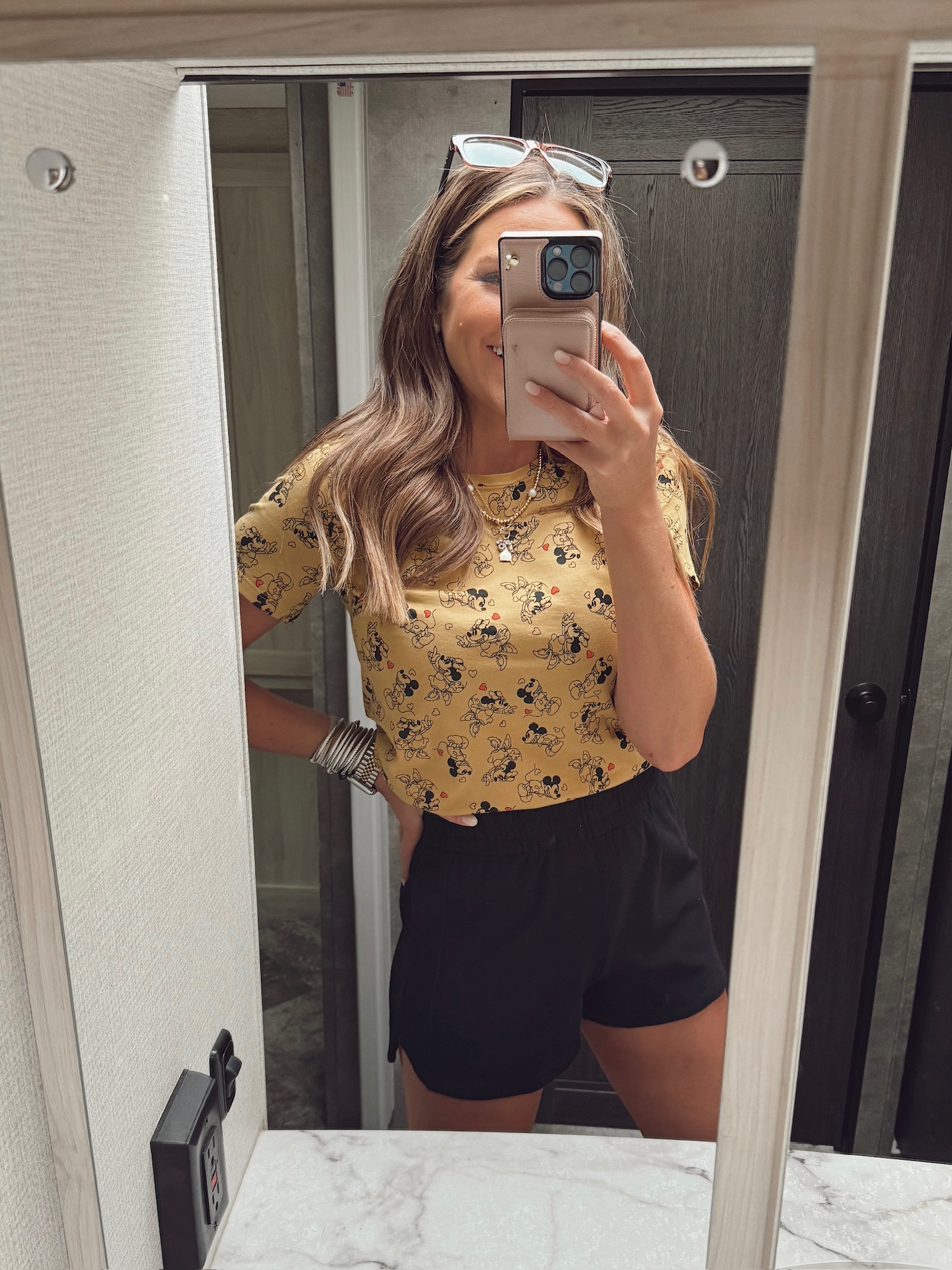 In a small tee from a 2 pack, medium sweat shorts, sunglasses and accessories for spring Disney outfit – all fits TTS.