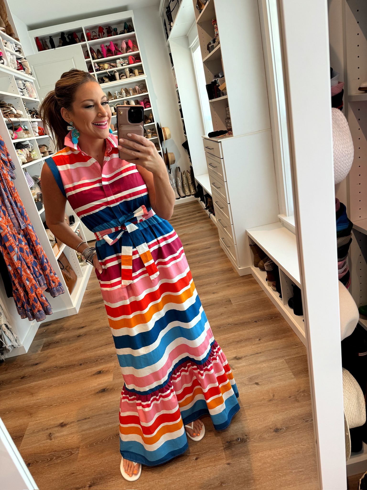 In a size 6 colorful stripe maxi, sandals, earrings and accessories for spring – all fits TTS.