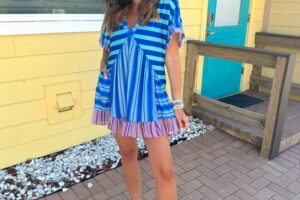 In a small 2 piece set with button down top and shorts, necklace, bracelets, sunglasses and accessories for spring outfit – all fits TTS.