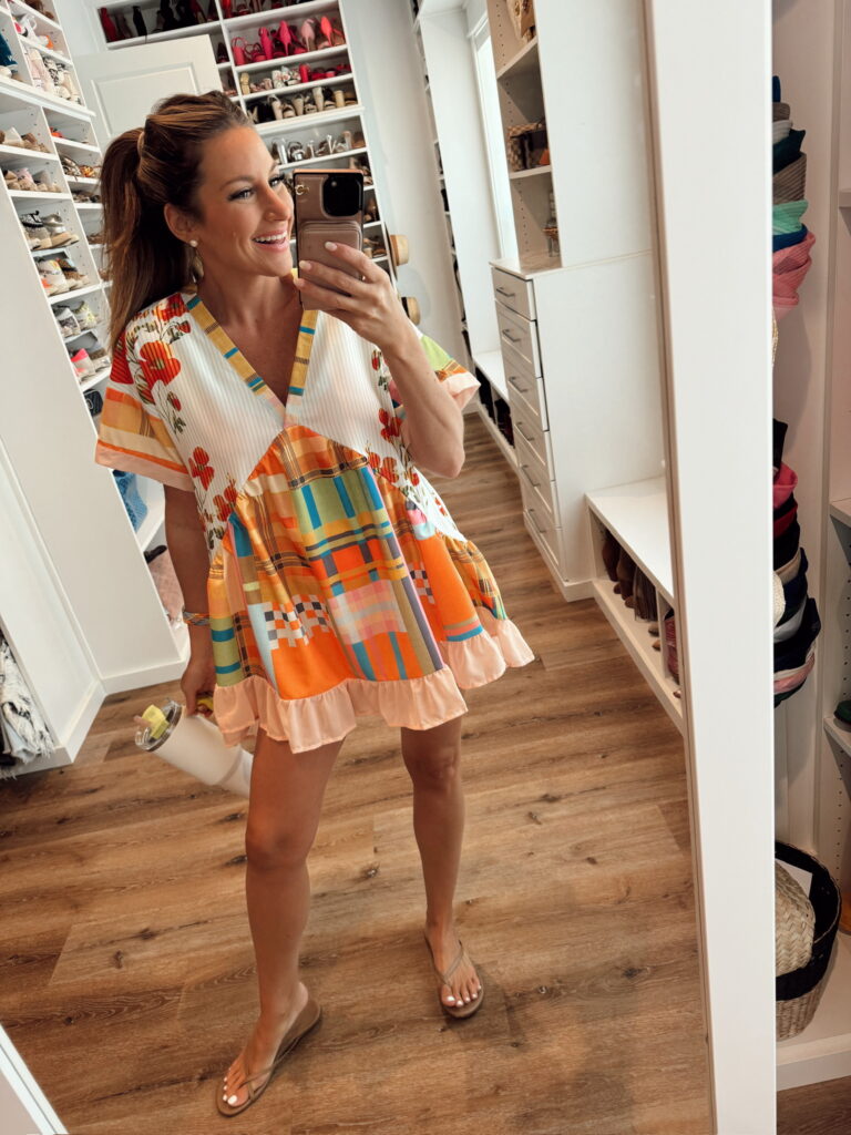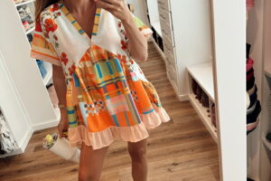 In a small backless midi dress, sandals, necklace, beaded bag and accessories for spring – all fits TTS.