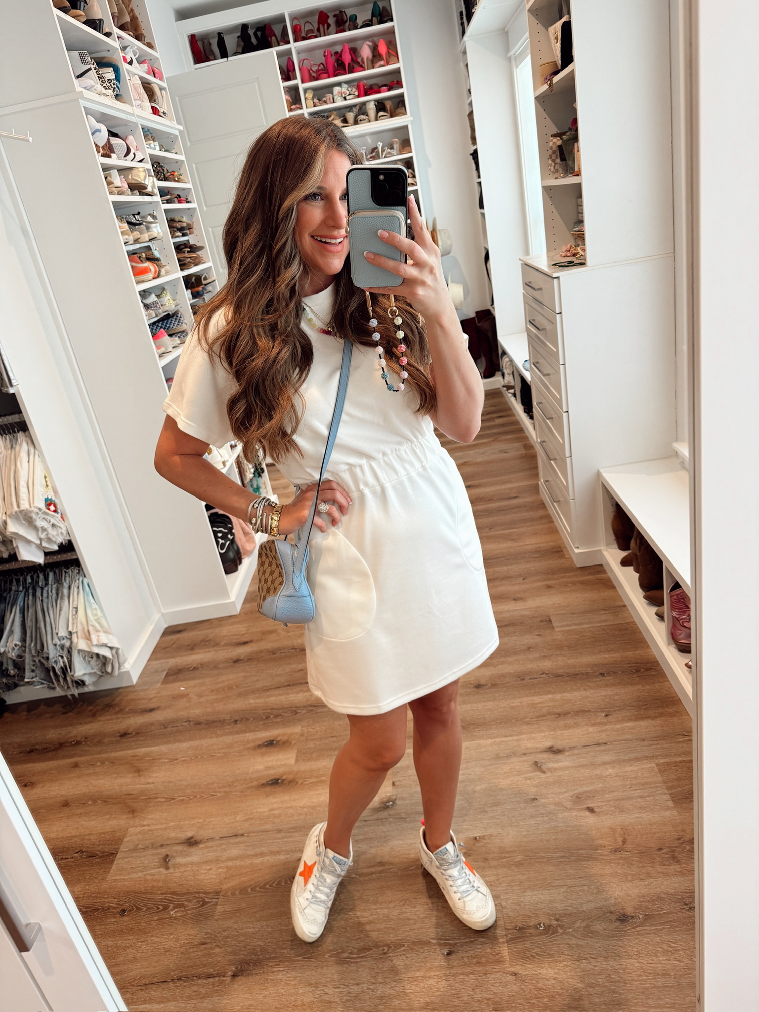 Spring Outfit In a medium drawstring waist t shirt dress, sneakers and accessories- all fits tts. Shop the items here! subscribe withBlogLovin' or Email share follow me onLIKETOKNOW:IT
