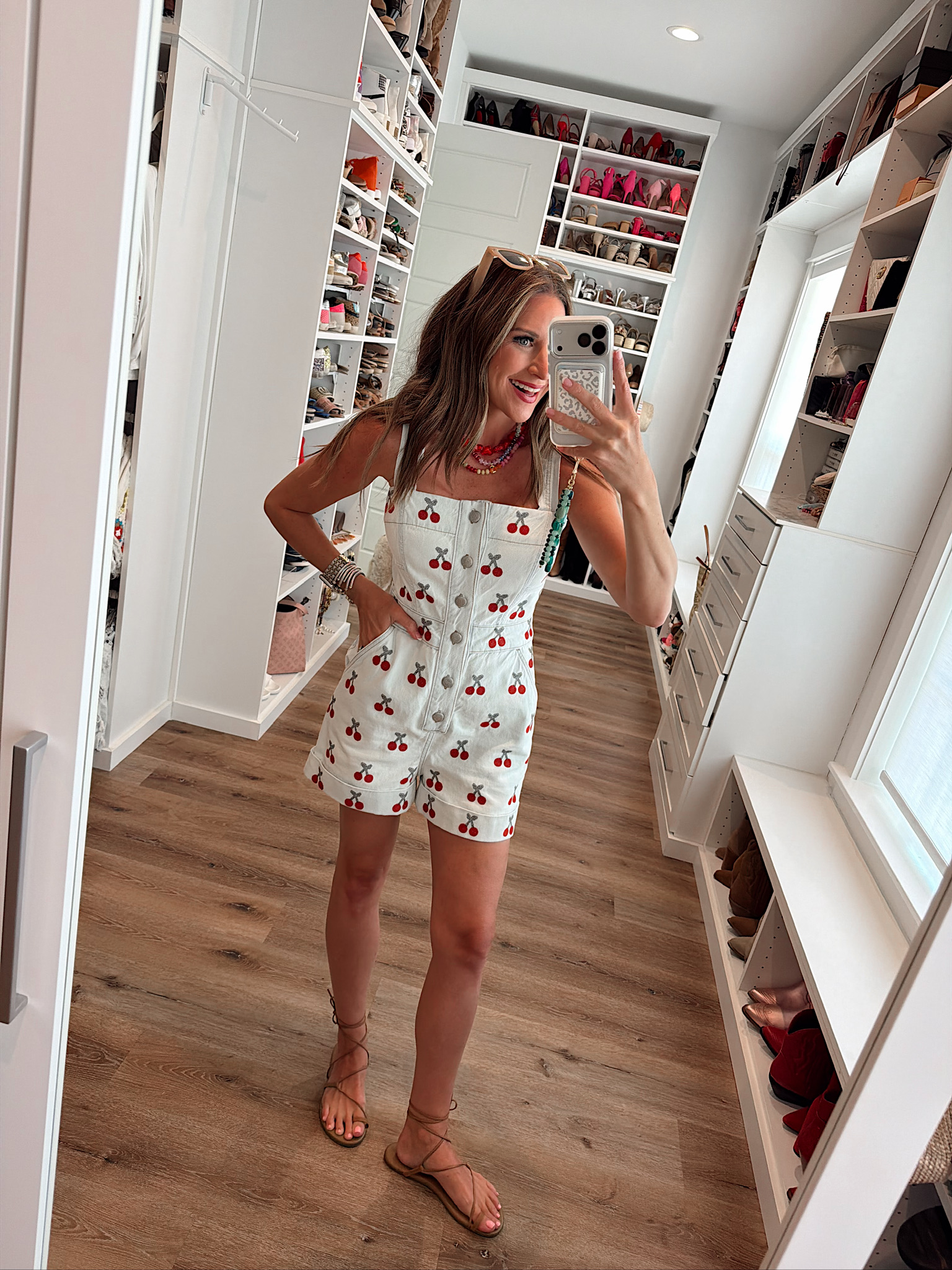Spring Outfit In a small cherry denim romper and accessories – fits tts. Shop the look here! subscribe withBlogLovin' or Email share follow me onLIKETOKNOW:IT