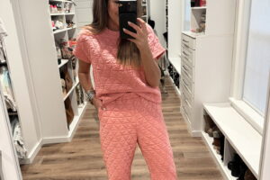 In a small pink plaid jacket, medium 2 piece set with quilted tee and wide leg pants, sneakers and accessories for Spring – all fits TTS.