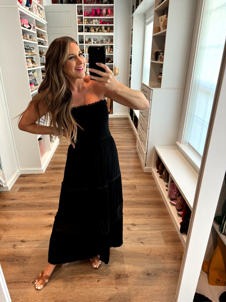 In a small strapless side slit maxi, espadrille wedges, necklace and accessories- all fits TTS.