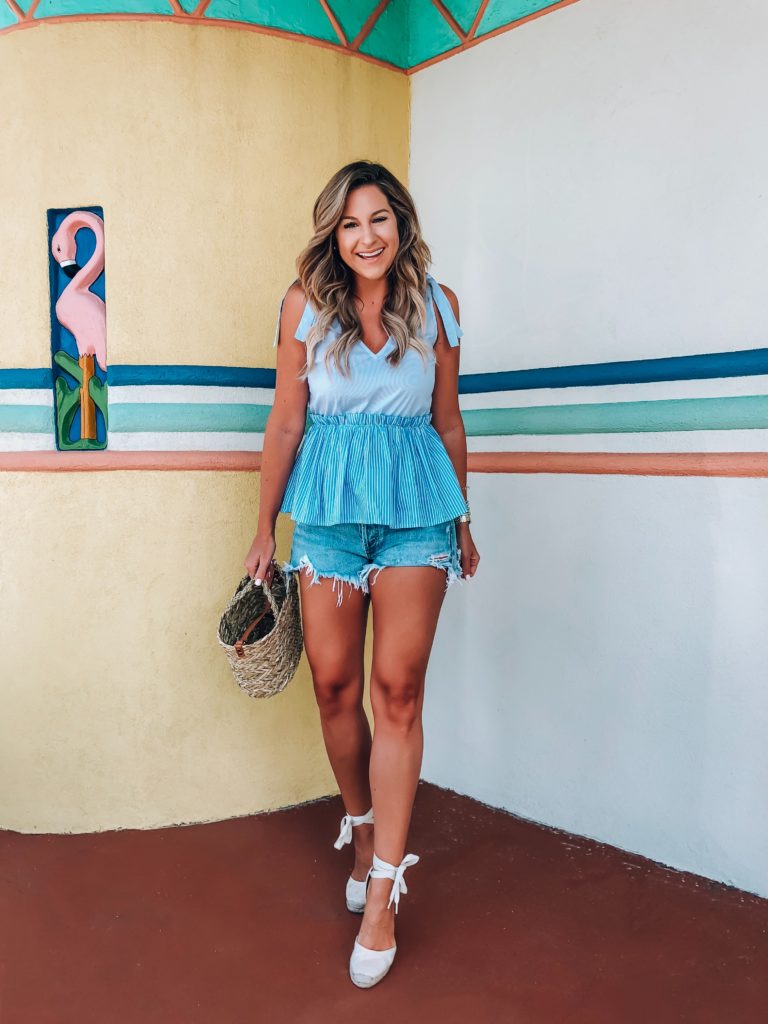 Outfit Details: Stripe & Palm One piece Swimsuit (order true size, $17 on amazon prime), Tory Burch Sandals, Cult Gia Bag (shop knockoff on Amazon here)