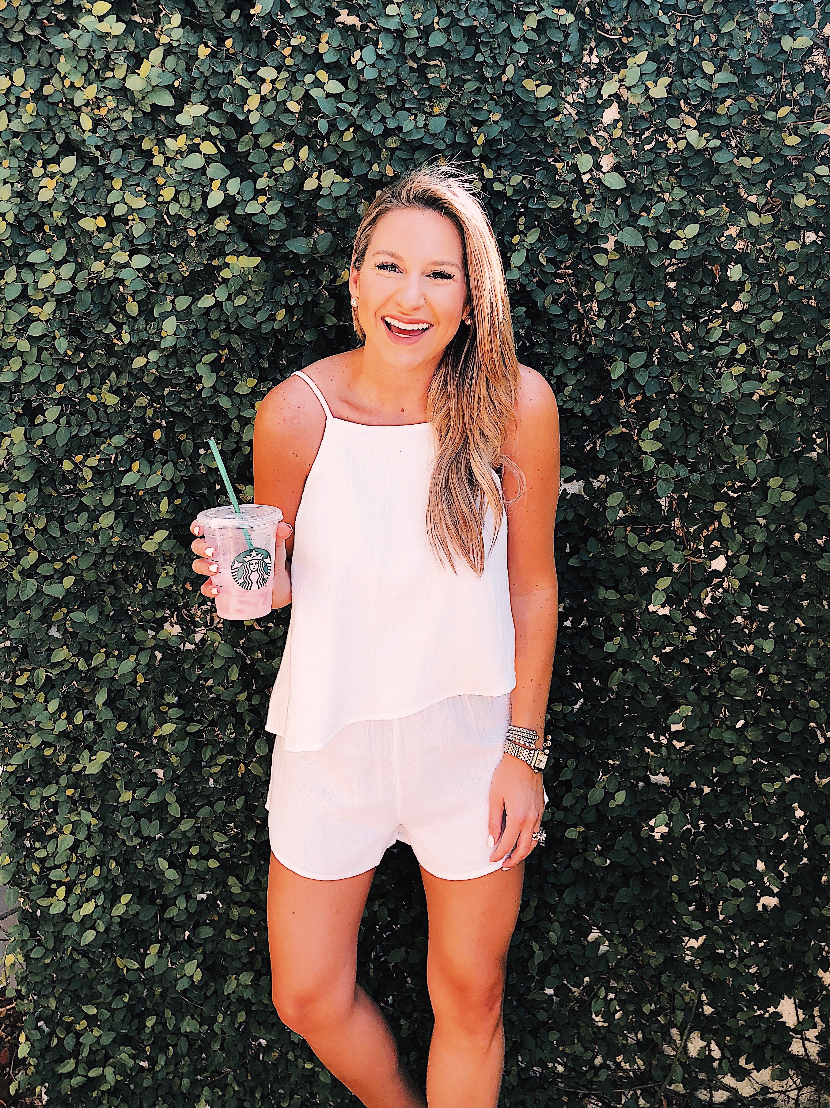 White summer romper (less than $50), Soludos braided flats, Cult Gia bag, Pearl earrings, curling iron.