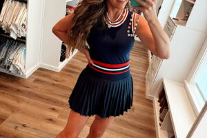 In a medium stripe 1/2 zip sweatshirt, medium active shorts, sandals and accessories- fits tts. Shop the items here!