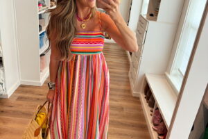 In a small button down floral top and matching small floral shorts from Target for spring – all fits TTS.