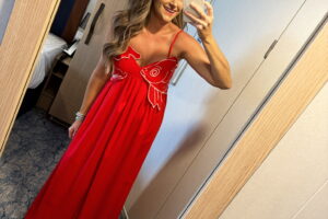 In a small tiered t-shirt dress, large cardigan, sandals, necklaces and accessories – all fits TTS.