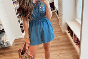 In a small Ellie nap dress, medium cardigan, sandals, large weekender tote and accessories – all fits tts. Shop the items here!