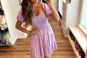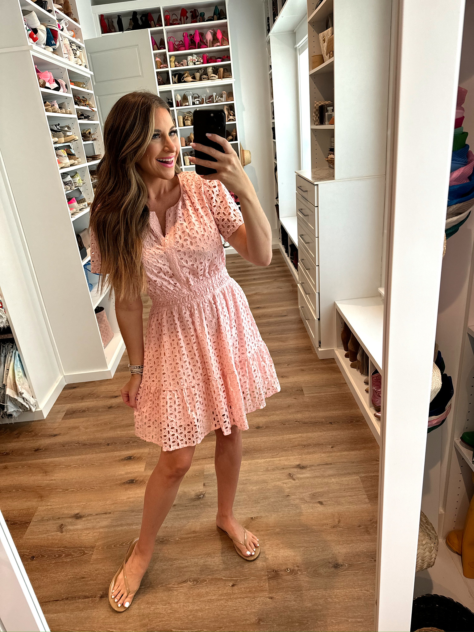 In a medium v neck hollow lace mini dress, sandals and accessories- all fits TTS.