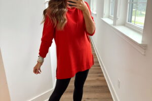 In a medium white knit tunic sweater, small faux leather leggings, ankle boots and accessories for winter outfit – all fits TTS.