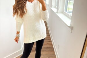 In a medium black sherpa varsity jacket, medium black tee, small faux leather leggings, ankle boots and accessories for winter outfit – all fits TTS.